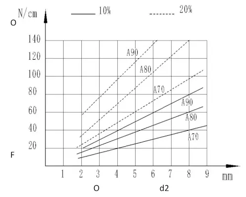 Elongatio = (D-II / D2) × C% In aequatione D-imo diameter ad montems sulcus in radiale foraminis sigillum D2-in interiore diameter de o-anulum (II) ad radiale sigillis, in o-anulus est potissimum compressi per suam circumferentiam (i.e. D1> d) et maximum licita circumferentia compressionem rate est III%. Ratio compressio = (D1-D) / D1 × C% In aequatione D1, exterior diameter O-anulum D-fundo diameter ascendens sulcus sulcus in radiale hastile sigillum VI. O-annulos sunt sicut rotating hastile signacula O-annulos potest etiam esse ut sigillis pro low-celeritate gyrationis et brevi-cycle rotating sagitts. Cum autem exigit celeritas inferior 0.5m / s, in O-circulum lectio potest secundum normalis consilio signa; Cum autem circumferential celeritas est altior quam 0.5m / s, necesse est considerare phaenomenon quod elongata Flexilis anulum et refugiat postquam calefacta (joule est electus est circa II% maius quam diametri signati esse ad esse de diameter est in diametri et in diametrum potest esse vitanda. Post O-anulum est installed in sulcus, radiariter compressi ad formare a fine torrugation, ita improving in lubricatis conditionibus. VII. Installation compressionem Force Per installation, et compressio vis est ad gradus initial compressionem et duritiam materiae. Figura ostendit necessitudinem inter unitas compressionem vim et crucem-sectional diameter per centimeter ex sigillis circumferentiam, quod est adimandum magnitudinem compressionem vim cum installing in O-anulum.